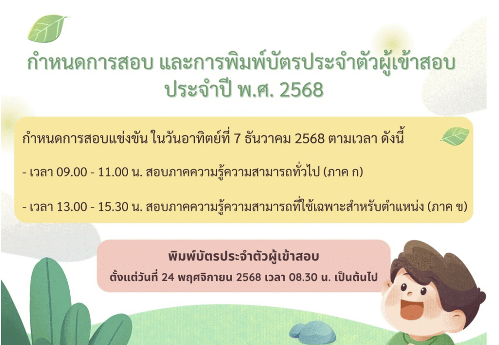 ทั้งนี้ ผู้สมัครสามารถเข้าไปพิมพ์ “บัตรประจำตัวผู้เข้าสอบ” ได้ตั้งแต่วันที่ 24 พ.ย. 68 เวลา 08.30 น. เป็นต้นไป